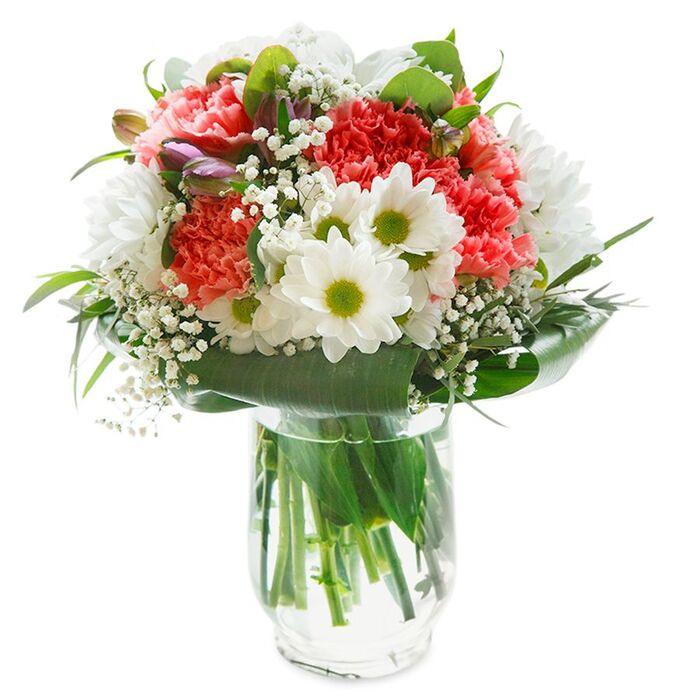 Overflowing with cheerful tenderness, this skillfully arranged bouquet is staged in a flawless white square gift bag, channeling the inviting spirit of Chase Cross on a bright spring morning. The heart of the display is filled with lavish carnations in shades of warm coral, peach, and bold red, each bloom flounced with ruffled petals that seem almost to dance. Crisp white daisies, highlighted by their vibrant green-yellow eyes, weave through the arrangement, lending bursts of lightness and innocent happiness. Wisps of baby's breath drift like gentle puffs of cloud between the stars of the bouquet, their delicacy enhancing both contrast and charm. On the left, a hint of closed buds with a purple glow nestle in, promising the arrival of new beauty. All of these flourish above a bed of lush, deep green foliage with a glossy finish, creating a soothing, cradling effect akin to wandering through the greenery of Chase Cross's local parks. The practical yet elegant gift bag-complete with crisp ribbon handles-elevates the bouquet for gifting or doorstep delivery. Each stem has been thoughtfully placed, forming a full and rounded shape that feels abundant and sincere. The whole tableau glows under soft light, accentuating freshness and care-a perfect choice to mark a birthday, celebrate new beginnings, or simply put a smile on someone's face. This arrangement is crafted as only a true local florist could, with knowledge, artistry, and a heartfelt connection to the community. Celebrating the gentle promise of springtime around Chase Cross, this artful bouquet brings together the familiar and the uplifting in every bloom. Arranged with finesse and care, the bouquet's circle of lively coral-pink carnations and snowy daisies, each with fresh green hearts, is immediately warming to the eye. Spirals of airy baby's breath float amidst, creating a dreamy haze reminiscent of soft clouds drifting over Chase Cross's open spaces. Sprigs of eucalyptus-shaded silver and green-frame the arrangement, their herbal essence subtly perfuming the air, while glimpses of unopened alstroemeria buds, tinged with muted pink and violet, add a refined undertone of anticipation. The bouquet radiates both calm and jubilation-the perfect centerpiece for a sunlit kitchen table or an encouraging gesture for someone living near White Hart Lane. Reflecting the neighbourhood's intimate charm and the skilled touch of Chase Cross Florist, this arrangement is equally suited to celebratory milestones, heartfelt thanks, or simple, everyday joy-each flower promising freshness and expertly crafted beauty, ready for delivery throughout the community. This uplifting arrangement glows with the cheer of a spring morning in Chase Cross. A spirited gathering of coral-pink carnations forms the bouquet's animated heart, their petals ruffled and light-catching, almost quivering with life. Orbiting them are crisp white daisies and daisy-like chrysanthemums, each with a brilliant green center, radiating a fresh, innocent charm that feels at home along the walkways near Bedfords Park. Airy strands of baby's breath weave between the larger flowers, softening edges with their cloud-like lightness. Magenta alstroemeria buds, not yet fully open, add a gentle pop of deeper color and signal blooms still to come. The arrangement is gracefully skirted with broad, glossy green leaves, the richness of their shades echoing the foliage that lines local gardens. All rests in a simple, transparent glass vase, its water sparkling and cool, proudly revealing the strong stems beneath. Even, bright lighting reveals every nuance of color, petal, and texture. Created with meticulous attention by a local florist in Chase Cross, this bouquet brings natural simplicity and a heartfelt sense of celebration, perfect for gifting on special occasions, offering encouragement, or brightening a loved one's day anywhere in the area.